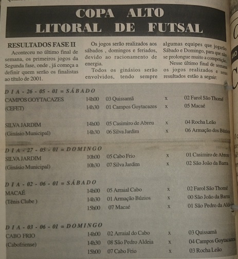 Depois de passarem pela fase eliminatória e semifinal, as equipes de Cabo Frio e Búzios se classificaram para a partida final no ginásio da Cabo-friense. O público compareceu para prestigiar a vitória da seleção de Cabo Frio pelo placar de 5x1, que conquistou o título de campeão da Copa Alto Litoral em 2001.